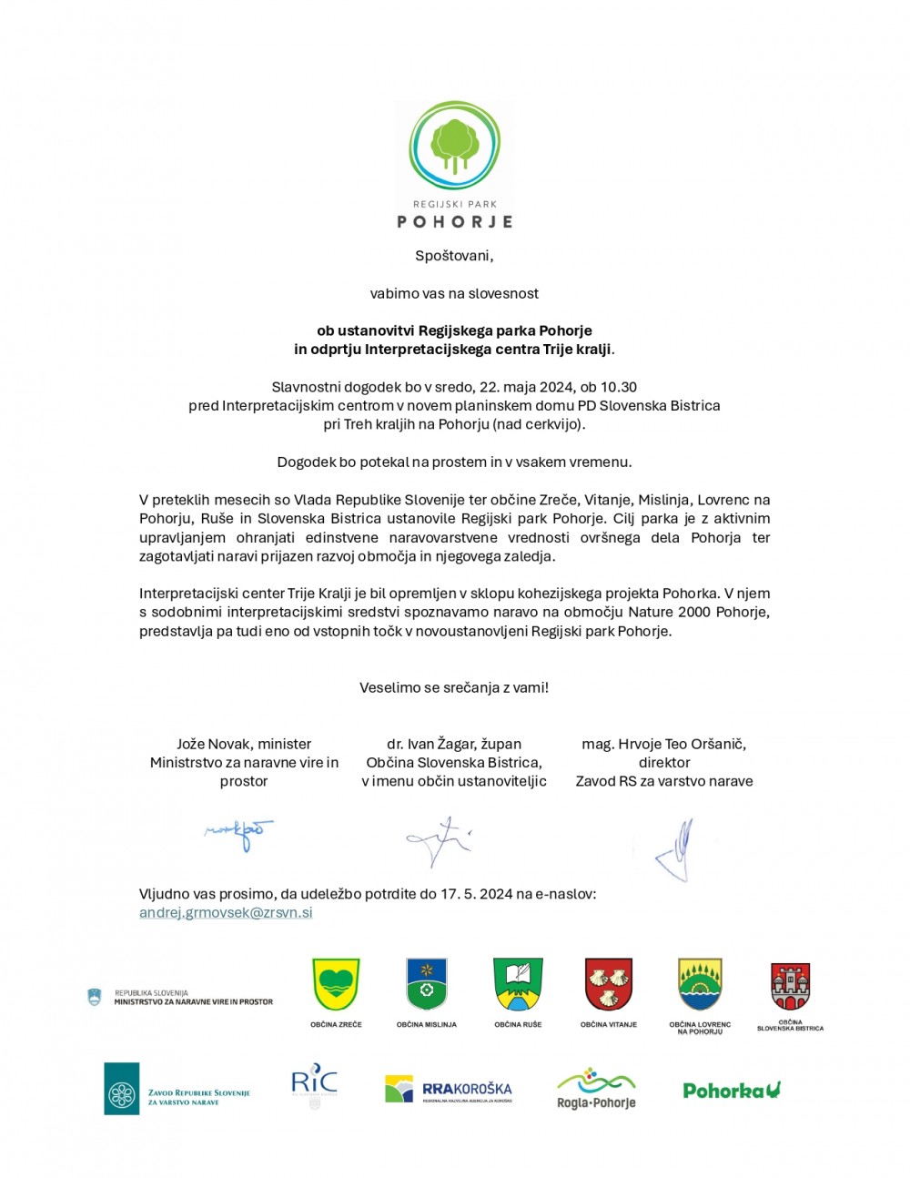 22.05.2024 / Kulturna prireditev, ogledov: 680 Slovesnost ob ustanovitvi Regijskega parka Pohorje in odprtju Interpretacijskega centra Trije kralji | Vrsta dogodka | Kulturna prireditev | Območje | Gričevja in hribovja severovzhodne Slovenije | Kdaj | 22.05.2024 10:30, Trije kralji na Pohorju | Kje | Trije kralji na Pohorju | Organizator | Regijski park Pohorje |
