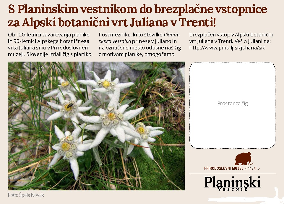 torek, 21. junij 2016 ob 12:30, ogledov: 6900 S Planinskim vestnikom do brezplačne vstopnice za Alpski botanični vrt JulianaAvtor: Manca Ogrin | | Ob 120-letnici zavarovanja planike in 90-letnici Alpskega botaničnega vrta Juliana so v Prirodoslovnem muzeju Slovenije izdali žig s planiko. Posamezniku, ki junijsko številko Planinskega vestnika prinese v Juliano in na označeno mesto v reviji odtisne žig z motivom planike, omogočajo brezplačen vstop v Alpski botanični vrt Juliana v Trenti. | "Letos mineva že devetdeset let, odkar je Tržačan (sicer pa švicarski državljan francoskega rodu) Albert Bois de Chesne ustanovil Alpski botanični vrt Juliana. Ko se z jeklenimi konjički spustimo čez prelaz Vršič v Trento, niti ne slutimo, da prav v bližini ceste leži botanični biser, kjer na majhnem območju uspevajo številni rastlinski zakladi Slovenije. Na alpski botanični vrt pri zaselku Pri cerkvi nas opozorijo rjave obveščevalne table," v junijski številki Planinskega vestnika začenja svoj zapis o Julianinih 90 letih Špela Novak iz Prirodoslovnega muzeja Slovenije. V aktualni številki Vestnika pa lahko preberete tudi pogovor z dr. Nado Praprotnik, ki je vrsto let vodila Alpski botanični vrt Juliana v Trenti.