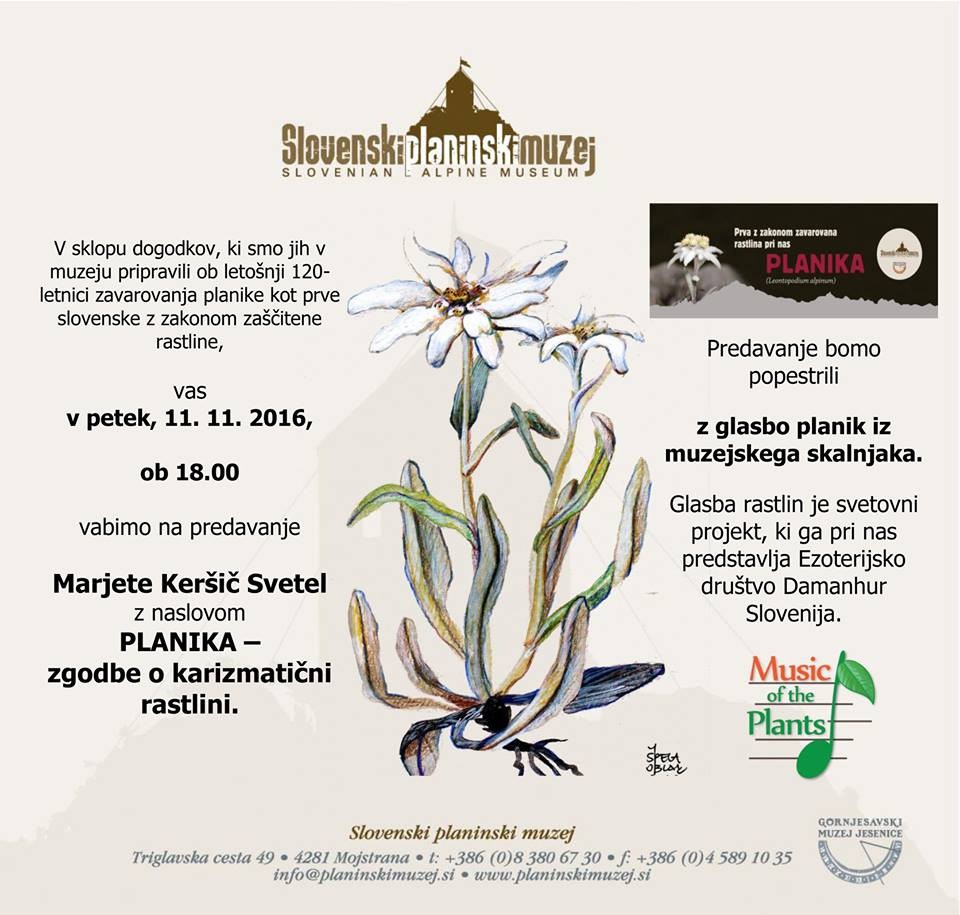 V sklopu dogodkov, ki so jih pripravili ob letošnji 120-letnici zavarovanja planike kot prve slovenske z zakonom zaščitene rastline, Slovenski planinski muzej v petek, 11. novembra, ob 18. uri vabi na predavanje Marjete Keršič Svetel z naslovom PLANIKA - zgodbe o karizmatični rastlini.