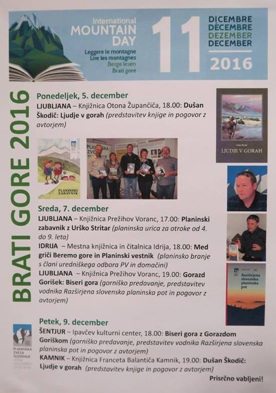 nedelja, 4. december 2016 ob 11:00, ogledov: 11112 Brati gore 2016 – dogodki po vsej SlovenijiAvtor: Manca Ogrin | | Planinska zveza Slovenije in številna planinska društva se po uspešni prvi izvedbi pridružujemo pobudi Alpske konvencije Brati gore 2016 ter v sodelovanju s knjižnicami in drugimi kulturnimi hrami v tednu pred 11. decembrom, mednarodnim dnevom gora, organiziramo številne dogodke po vsej Sloveniji – s skupno idejo: promocijo in praznovanjem kulturne raznolikosti v Alpah. Vabljeni k branju gora! | Festival Brati gore, ki poteka pod okriljem Alpske konvencije, je priložnost za praznovanje kulturne raznolikosti v Alpah. Gore bodo brali po vseh alpskih državah, tudi v Sloveniji se bo zvrstilo mnogo dogodkov. Spodaj nanizamo dogodke, ki jih organiziramo PZS ali planinska društva, na katerih sodelujejo avtorji ali sodelavci Planinske založbe in Planinskega vestnika, celoten seznam dogodkov pa najdete na spletni strani Alpske konvencije.