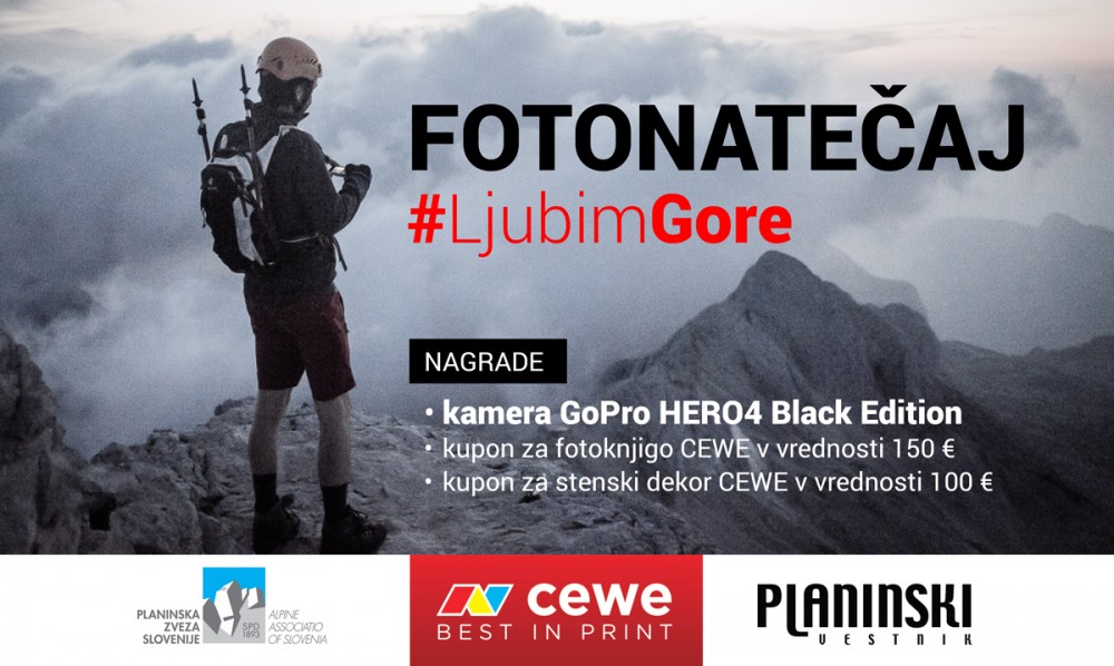 sobota, 9. september 2017 ob 09:00, ogledov: 36273 Nagradni fotonatečaj #LjubimGoreAvtor: Manca Ogrin | | Planinska zveza Slovenije z uredništvom Planinskega vestnika v sodelovanju s podjetjem CEWE, d. d., razpisuje nagradni fotonatečaj z naslovom #LjubimGore, ki poteka do vključno 15. oktobra 2017. Sodelujte v fotonatečaju za najboljšo poletno planinsko fotografijo in se potegujte za bogate nagrade: kamero GoPro ter kupone za izdelke Cewe. Vsak udeleženec prejme bon v vrednosti 10 evrov za nakup fotoknjige Cewe. | Številni planinci že vrvijo po planinskih poteh, plezalne smeri imajo vse več obiska, v hribih pa srečamo tudi množico drugih obiskovalcev "nekoristnega sveta", ki so se tja podali še kako drugače. Čisto vsak pa pri tem doživi svojo zgodbo ... Nekateri jih zapišejo, drugi jih shranijo v obliki videoposnetka, tretji najlepše trenutke zamrznejo s fotografijo.