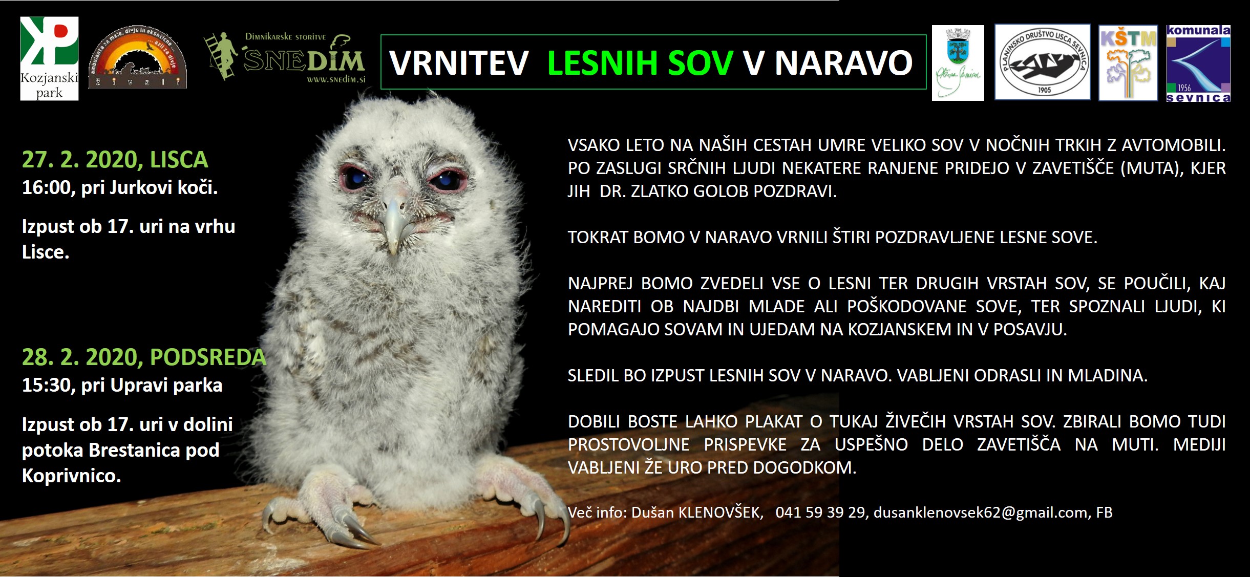 torek, 25. februar 2020 ob 00:00, ogledov: 2320 Vrnitev lesnih sov v naravoAvtor: Dušan Prašnikar | | Vabljeni na dogodek Vrnitev lesnih sov v naravo, na katerem bodo v naravo izpuščene štiri pozdravljene lesne sove. Pred izpustom boste lahko izvedeli vse o lesni ter drugih vrstah sov ter se poučili, kaj narediti ob najdbi mlade ali poškodovane sove. | Izpusti: