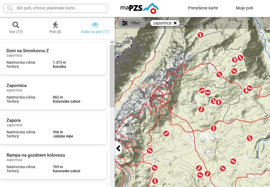 Podatki o lokacijah zapornic so vidni tudi na spletnem mestu maPZS. Svetujemo, da si planinci in ostali obiskovalci gorskega sveta tudi sicer ogledajo območje načrtovane ture prek maPZS, ki vključuje tudi aktualne informacije o morebitnih zaporah planinskih poti (bodisi zaradi vremenskih ujm, podorov ali drugih razlogov). |