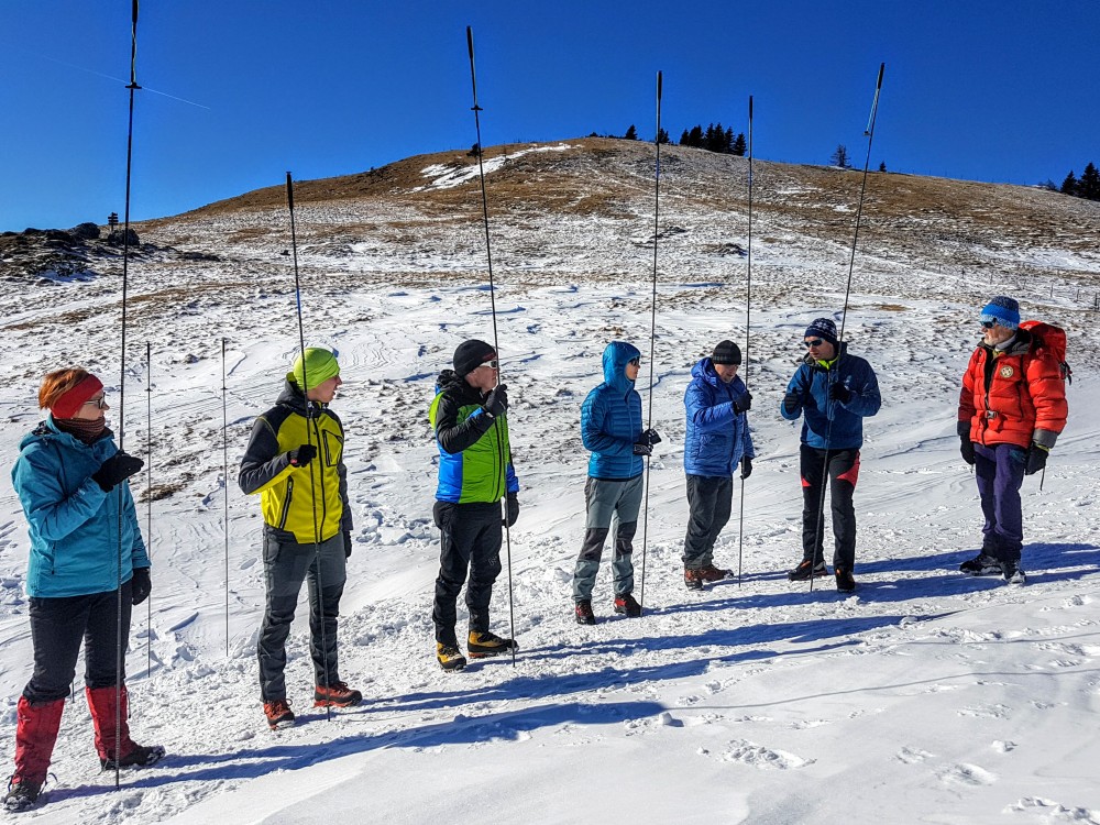 - 9.15 do 13.15 - praktični del (delo na deloviščih - uporaba in hoja z derezami in cepinom, iskanje s plazovno žolno, izkopavanje, sondiranje, plazovni nahrbtnik, zaustavljanje zdrsa s pomočjo cepina ...).