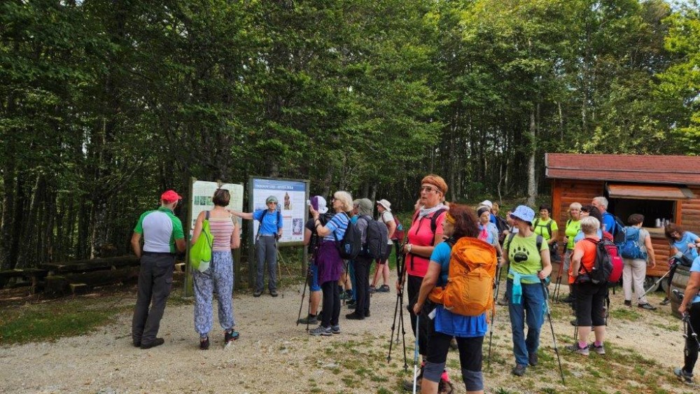 Rozi Skobe, nekdanja dolgoletna načelnica KVGN, aktualna vodja odbora VGN pri MDO PD, vodja prvih osmih usposabljanj za VGN pri PZS, vodnica PZS in prva varuhinja gorske narave iz leta 2002 predstavila Učno pot Trdinov vrh, njen pomen za predstavitev območja Gorjancev in posebnostmi, ki to območje uvršča v Natura 2000. Po tej 25 minutni predstavitvi smo se podali na 8,2 km dolgo pot učne poti, od točke do točke in prav ob vsaki smo se ustavili, da jo je Rozi podrobneje predstavila. Na Trdinovem vrhu smo si vzeli 15 minut za počitek, nato še kakih 10 minut pri Miklavžu ob gorjanskih košenicah, pa pri pred tedni dni prižgani oglarski kopi (22. točka poti), da bi nadvse zanimivo ekskurzijo zaključili ob 13.20 uri pri Domu pri Gospodični.