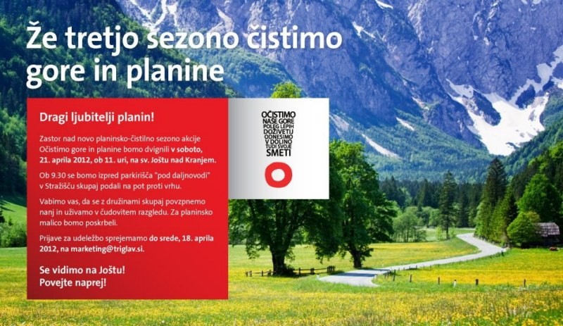 petek, 20. april 2012 ob 00:00, ogledov: 4300 Očistimo naše gore in planine 2012| Avtor: Zdenka Mihelič | | Že tretje sezono čistimo naše gore in planince. V akciji, prav posebej namenjeni našim goram, se bo aktivno pridružila tudi Planinska zveza Slovenije. Jutri, 21. 4., bomo na Joštu, na odprtju/začetku akcije skupaj z organizatorji. Vabljeni! A dragi obiskovalci gora in planin, vedno imejmo v mislih - odnesimo smeti s seboj v dolino. |  |