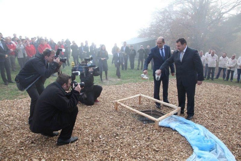 vrčka vode, ki so jo v jašek naprave zlili sevniški župan Srečko Ocvirk,